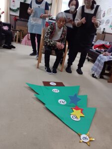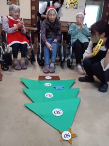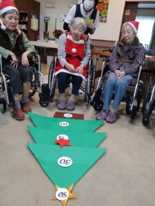 クリスマスソング合唱後はゲームを行いました。ゲームはチーム対抗戦でクリスマスツリーに向けて飾りの星を投げ、ツリーに表示された得点を競います☺