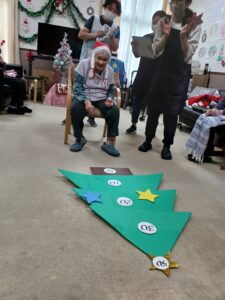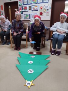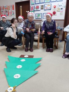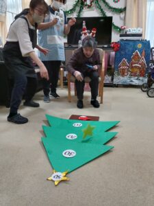 クリスマスソング合唱後はゲームを行いました。ゲームはチーム対抗戦でクリスマスツリーに向けて飾りの星を投げ、ツリーに表示された得点を競います☺