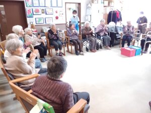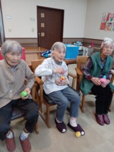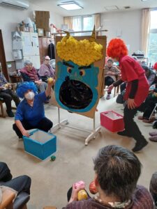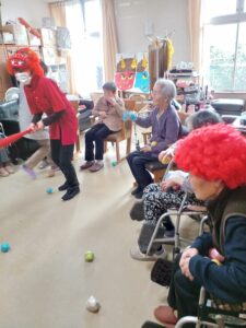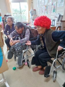 皆さん、お気づきのことでしょうが、中にはカラフルなアフロのカツラを被って楽しく参加される利用者様も(笑)